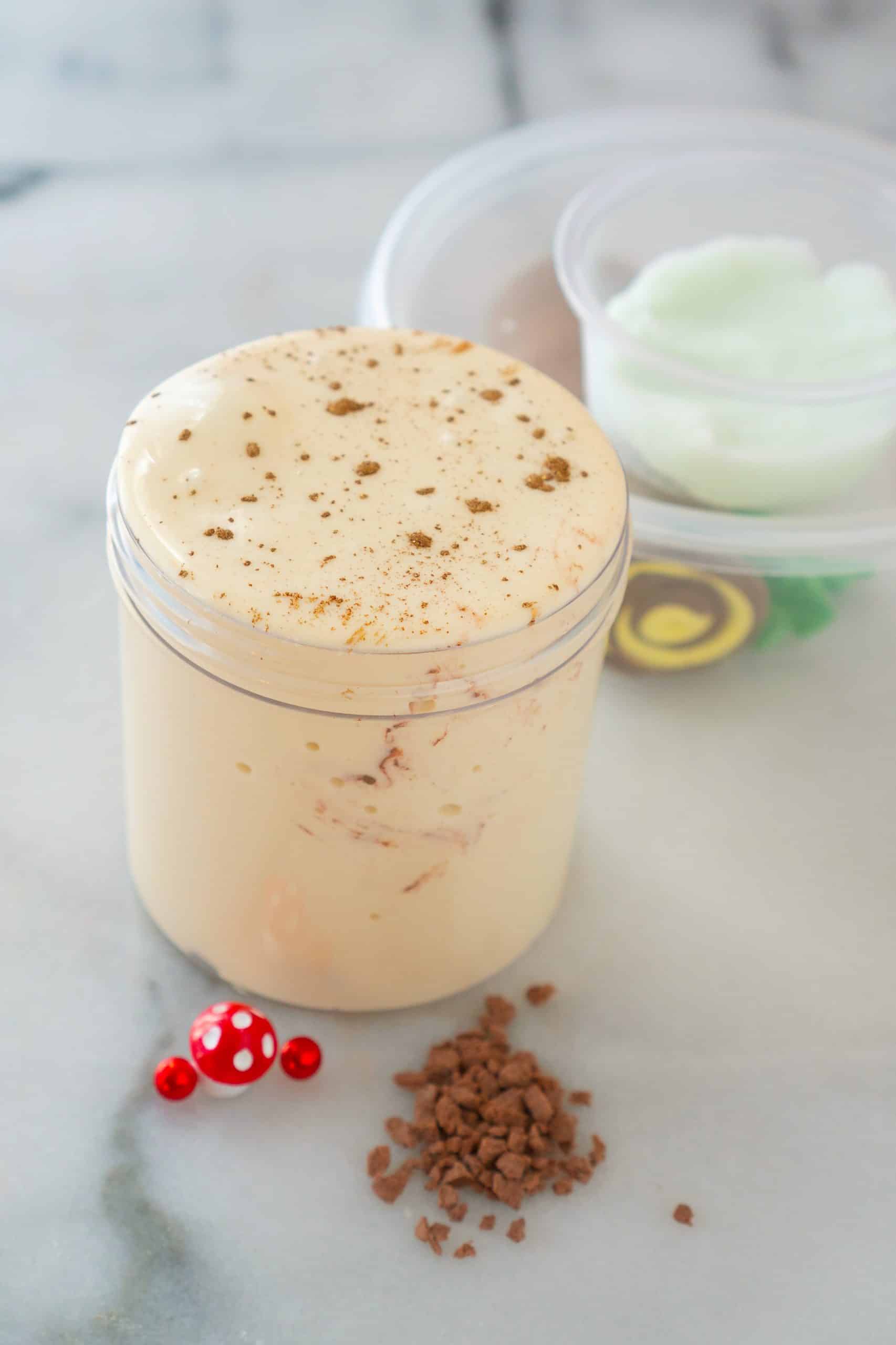 The base is a thick and glossy beige slime speckled with brown pigment flecks that mimics the look of a classic cup of eggnog. Add ins include a brown clay log, with golden swirls at the ends creating the illusion of a rolled yule log, nestled on green clay holly leaves. Shiny red beads double as festive berries, a cute red and white mushroom charm adds whimsy, and a small cloud of white slime is for drizzling on top like a dusting of snow. Don’t forget the polymer sprinkles that look just like chocolate shavings!
