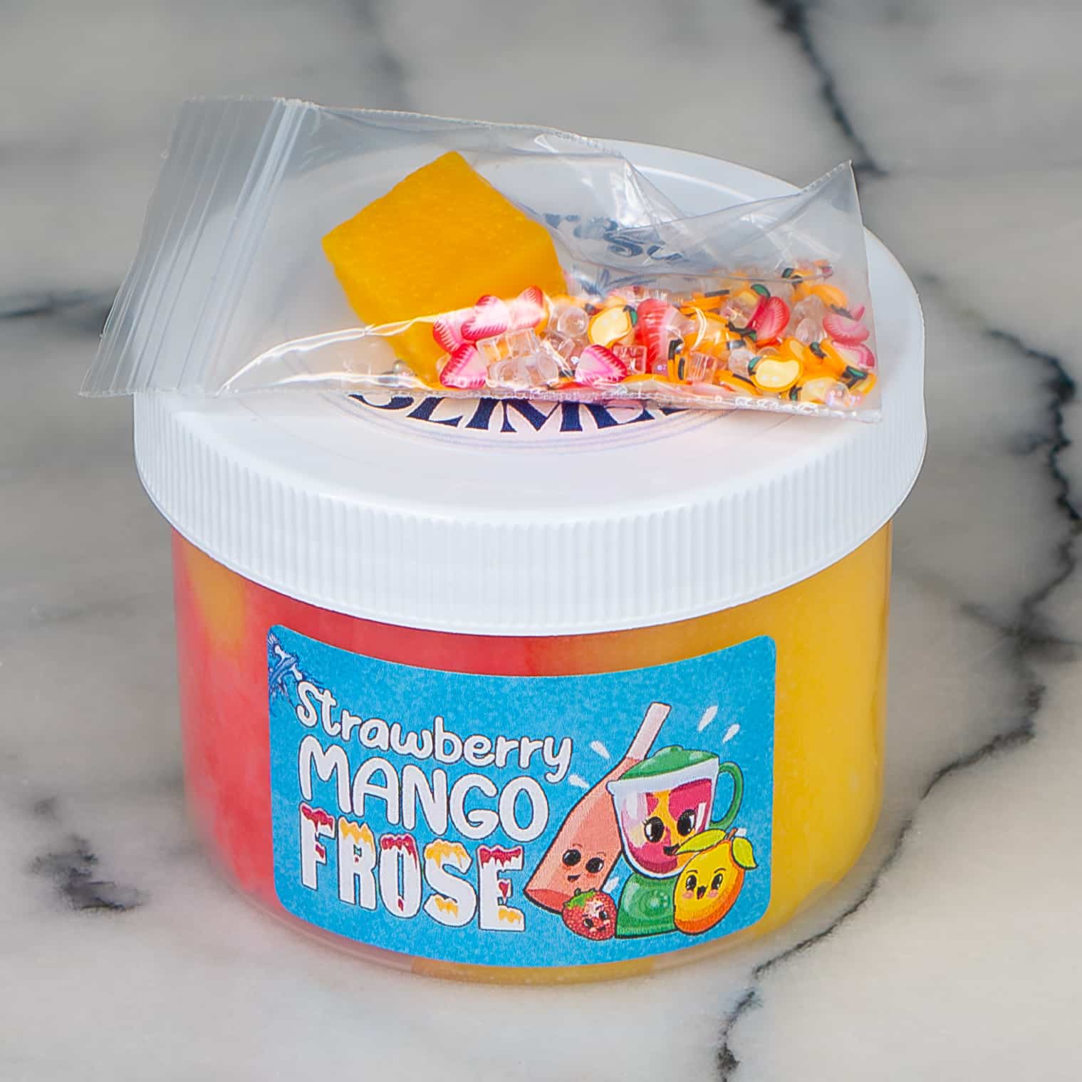 Indulge in a sensory delight with our Strawberry Mango Frosé Slime! This perfect blend of golden yellow icee slime and bright red cloud slime is a treat for your eyes AND nose, as it’s infused with the sweet scents of strawberries, mangoes, and rosé wine. With its swirly frozen cocktail appearance and vibrant aroma, it’s like a vacation in a jar.