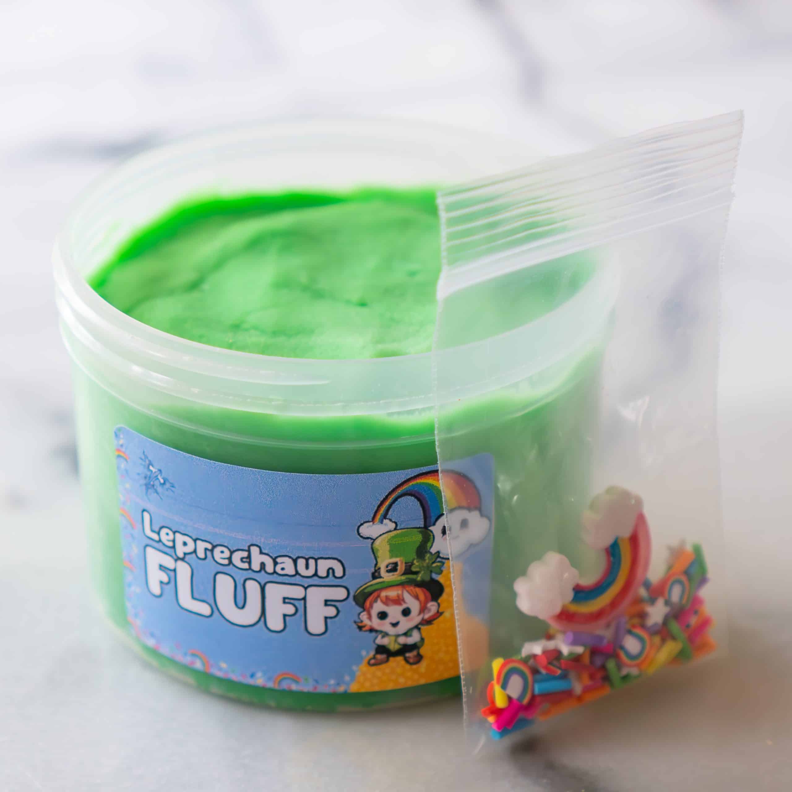 Leap into a world of whimsy and luck with our Leprechaun Fluff slime. This bright green cloud slime, reminiscent of the lush fields of Ireland, is scented like green apple Jolly Rancher and comes with a rainbow charm and rainbow sprinkles.  The cloud slime texture is wet, not sticky, and very moisturizing. When compacted its squishy and moldable, but fluffs and stretches into beautiful soft drizzles. It’s the perfect way to embrace the magic of St. Patrick’s Day!