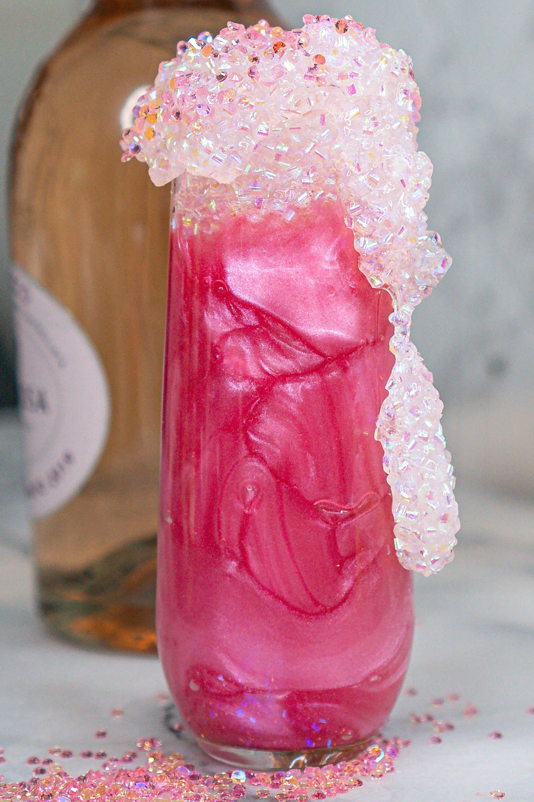 Inspired by a line from the song “Lady Marmalade”, we topped this slime with pink diamonds (aka rhinestones, we try to keep our prices low) for people who like to drink wine with diamonds in the glass.