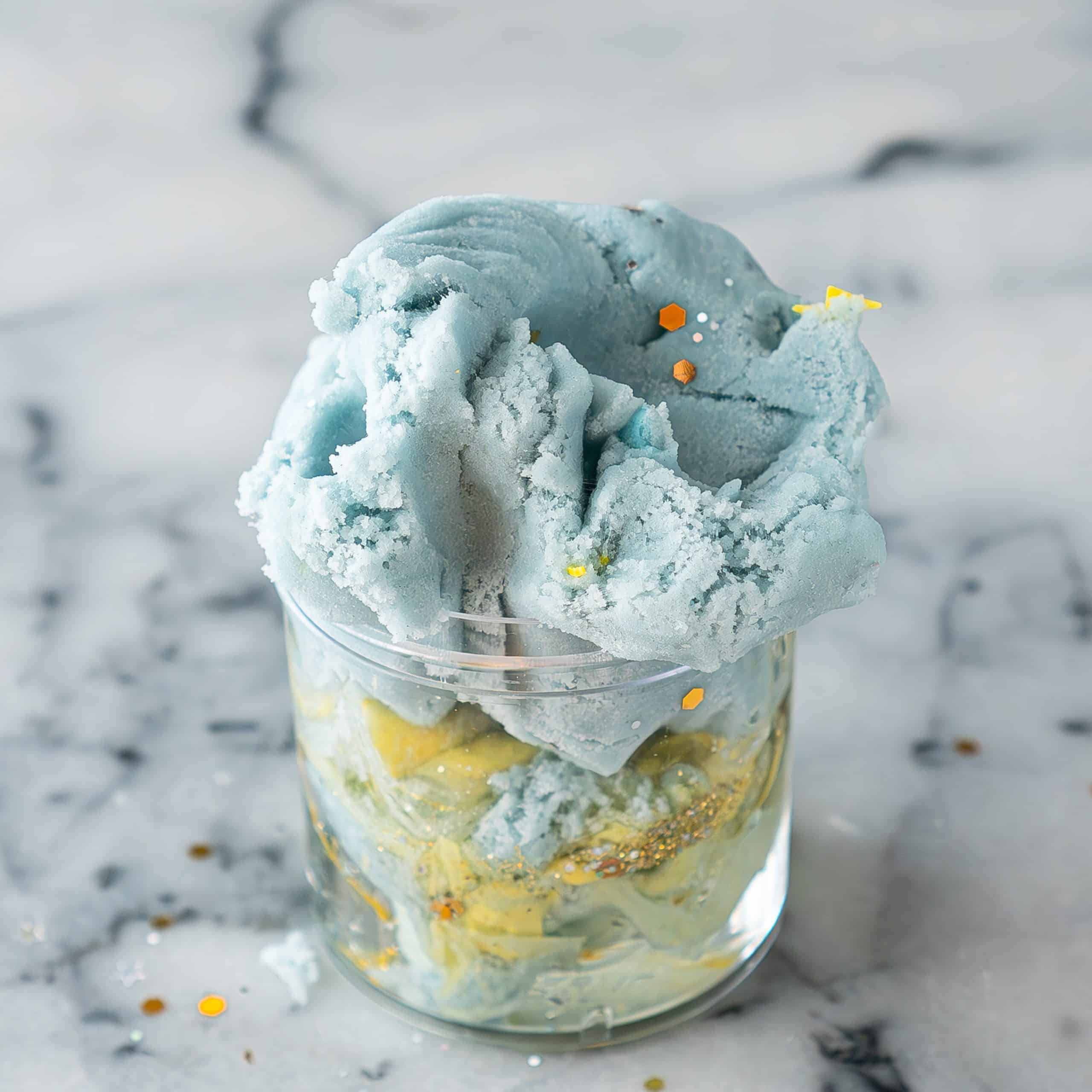 Breathe in the scent, and smell the electric charge of a thunderstorm. Add to the visual and tactile experience with the included golden glitter, lightning bolt sprinkles, and cloud charm. As you mix, your slime transforms into a pale dusty blue with a doughy icee slime texture. It’s holdable, stretchy, and perfect for bubble pops, offering a non-drippy option for slime regulation.